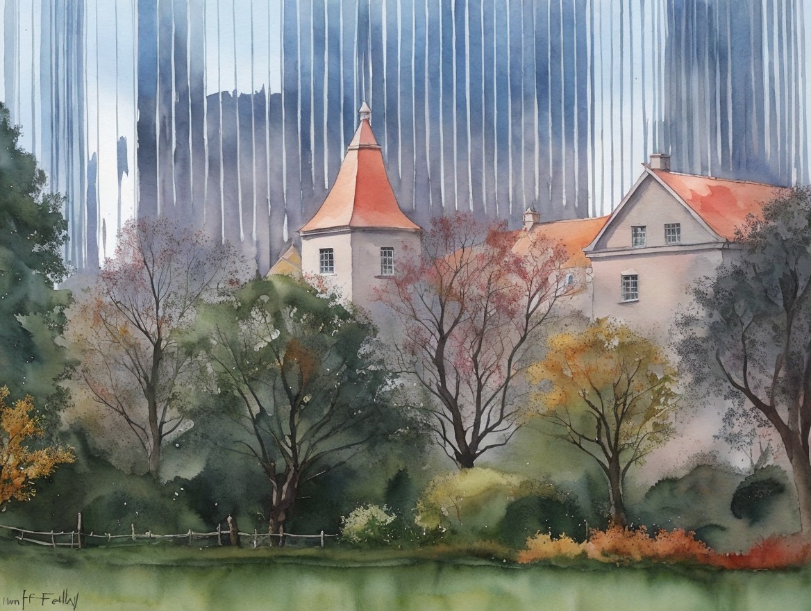 A serene landscape features two charming houses with red roofs, surrounded by misty trees in autumn hues. Soft rain cascades down, enhancing the tranquil, dreamlike atmosphere.