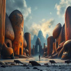 A surreal landscape featuring oversized formations resembling buildings, with a dramatic sky. Figures wander through the scene, while shadows stretch across the ground, creating an otherworldly atmosphere.