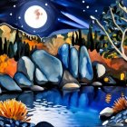 A serene winter landscape at night, featuring a glowing full moon, snow-covered mountains, and colorful autumn trees. A cozy cabin reflects on a calm, shimmering lake surrounded by rocks.