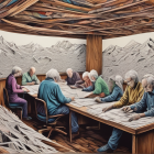 A group of elderly men sits around a large table in a wood-paneled room, intently studying maps or papers. The backdrop features a striking mountain landscape, blending reality and art.