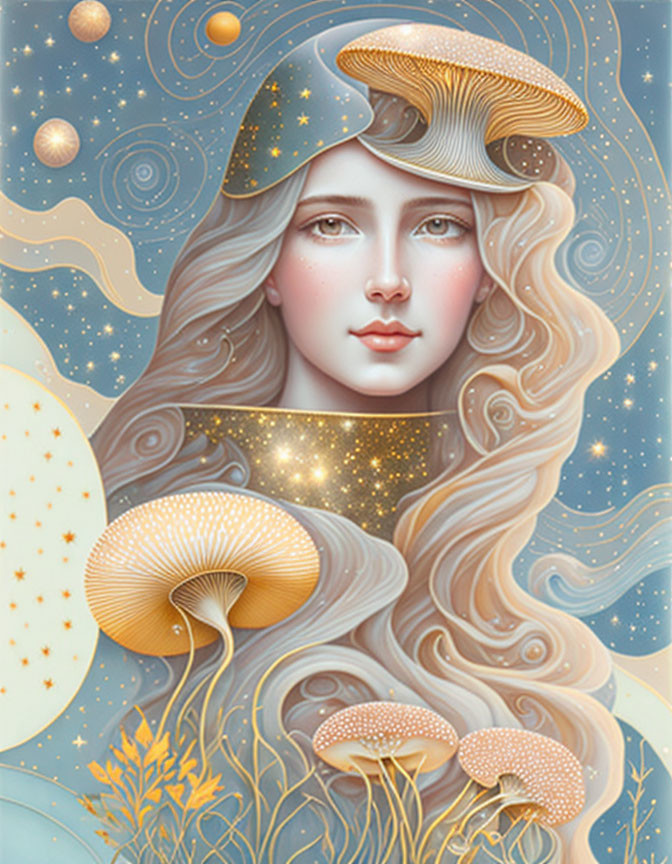 Surreal portrait of woman with celestial elements and glowing mushrooms