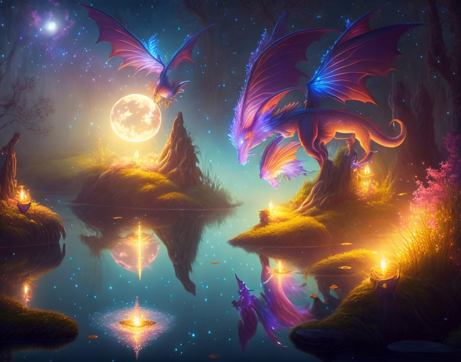 Vibrant dragons in mystical moonlit lake scene