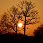 A vibrant sunset casts a warm orange glow over silhouetted trees, creating a serene and picturesque landscape. The sun rests low on the horizon, framed beautifully by the foliage.