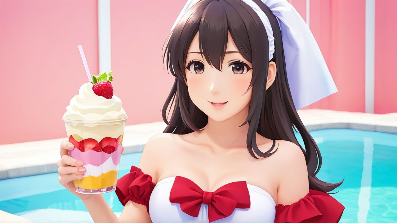 A charming anime character in a strapless swimsuit enjoys a delicious parfait, showcasing a playful and vibrant summer vibe. Her cheerful expression and colorful dessert create a delightful scene.