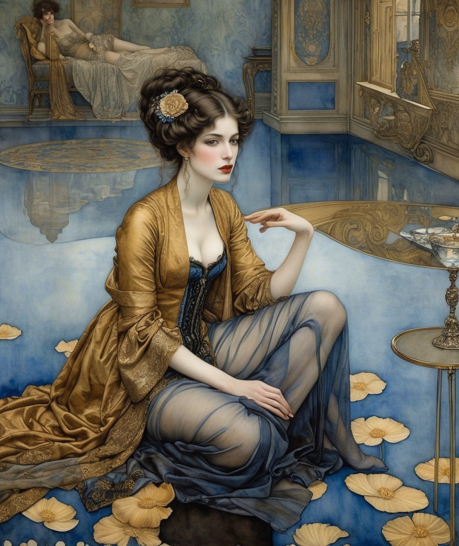 A woman in a luxurious blue and gold gown sits elegantly in a richly decorated room. Mirrors reflect her poised demeanor as she holds a cigarette, exuding vintage glamour and sophistication.