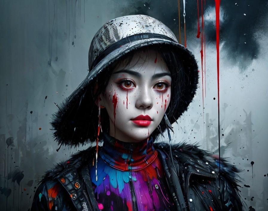 A colorful, digital artwork of a woman with a speckled, paint-splattered face and hat, red accents, and an intense gaze.