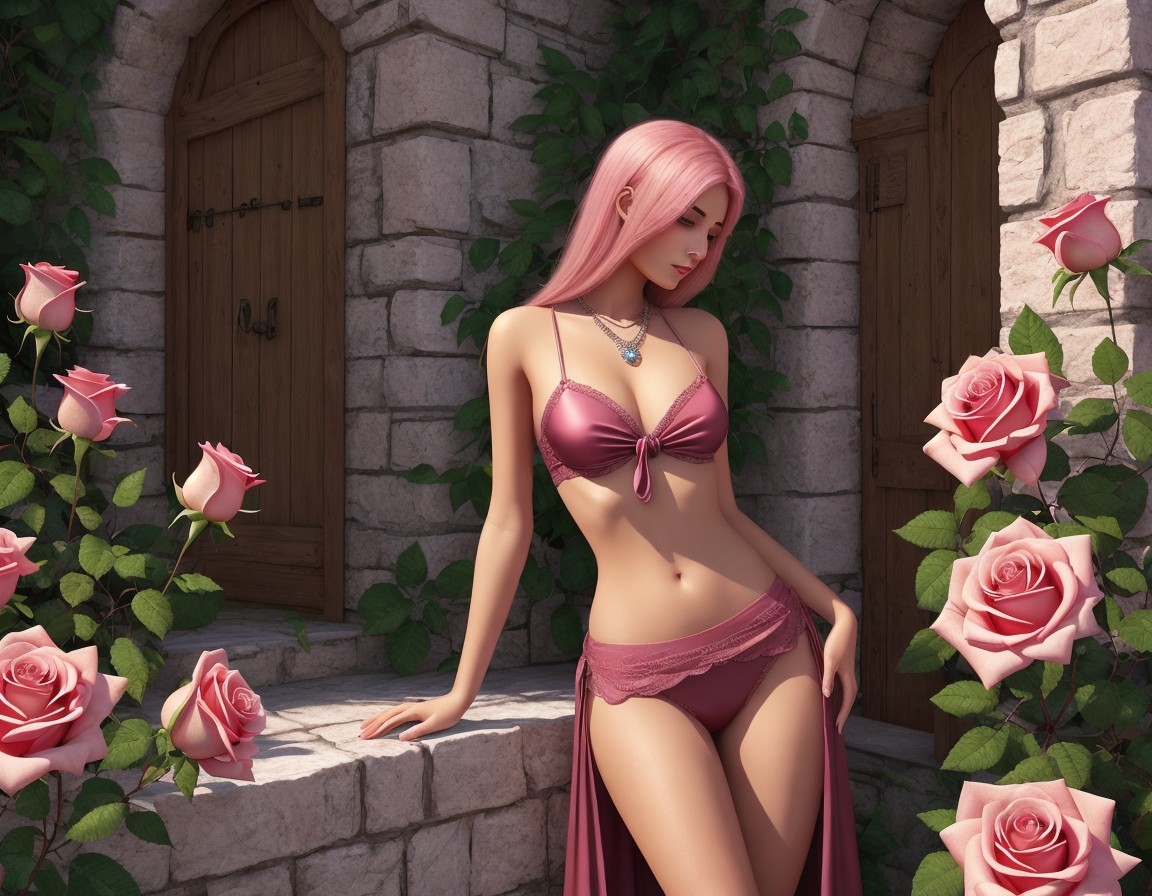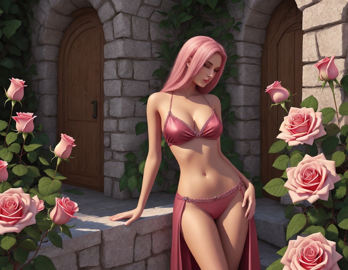 A 3D illustration of a woman with pink hair in a pink lingerie ensemble, posing by a wall with climbing roses.