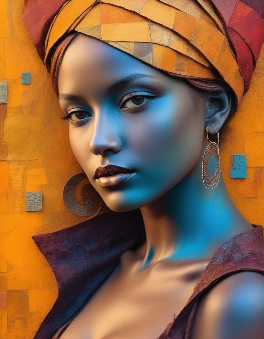 A woman with a colorful headscarf and striking blue eyes against a geometric patterned background.