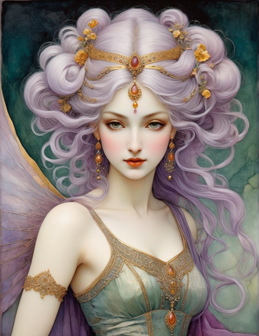Sylph – A mythological air spirit. 3rd century Persian miniature art, pinkish-purple, plum, amber, silver, sage green, mustard, paprika, Velvet Black, Shabby, Dull Gold, Amber Gray, Golden Ratio, Surreal Fantasy, Elegant, High Definition Ultra Fine 3D Line, Zenangle Style, Watercolor Patchwork , Arthur Rackham Style, Paul Kidby, , Jacek yerka, Extremely Detailed, Intricate, Thoughtful, HDR, Fractal, Beautiful, Award Winning, Fantasy Look, Fantasy, Crisp Quality
