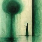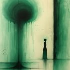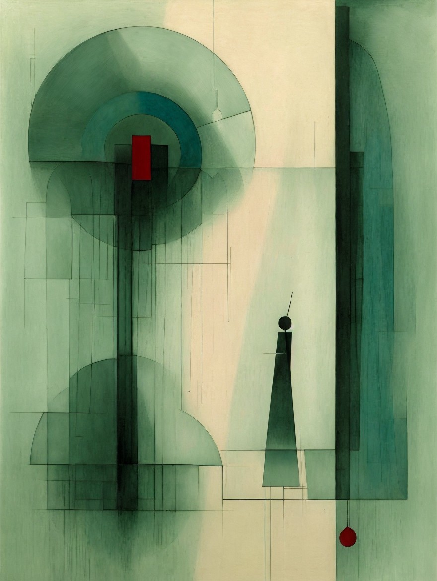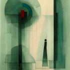 The artwork features abstract shapes in muted greens and greys, complemented by splashes of red. A tall, stylized figure stands beside geometric forms, creating a sense of solitude and contemplation.