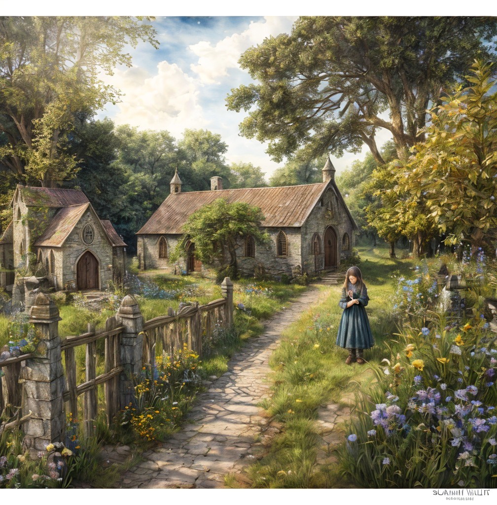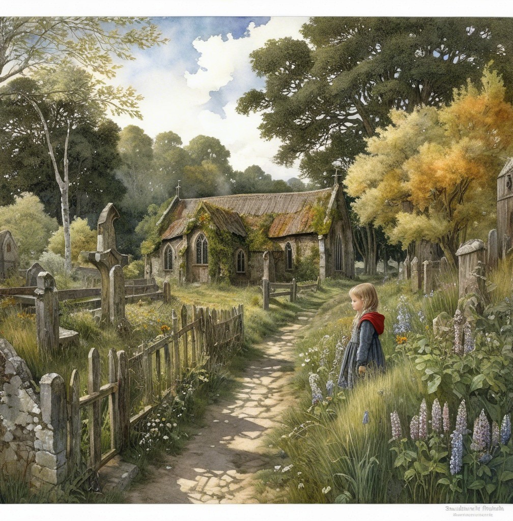 A serene scene depicts a quaint church surrounded by lush trees and a graveyard. A young girl stands on a path, gazing thoughtfully at the old church under a bright blue sky.