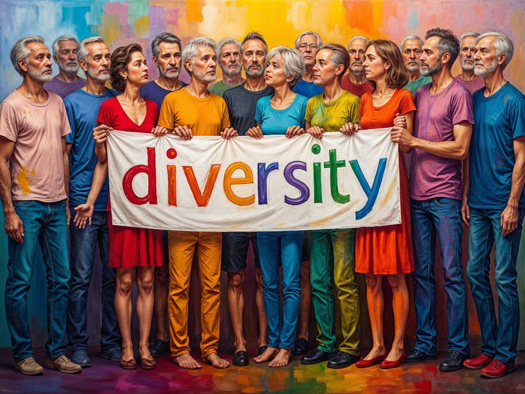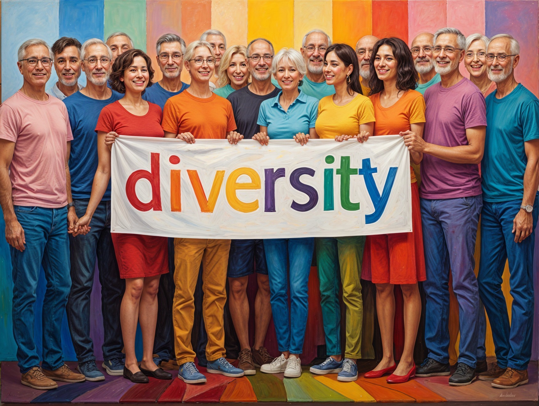 A diverse group of individuals stands together in front of a vibrant rainbow backdrop, proudly holding a banner that reads "diversity." Their attire features various bright colors, symbolizing unity.