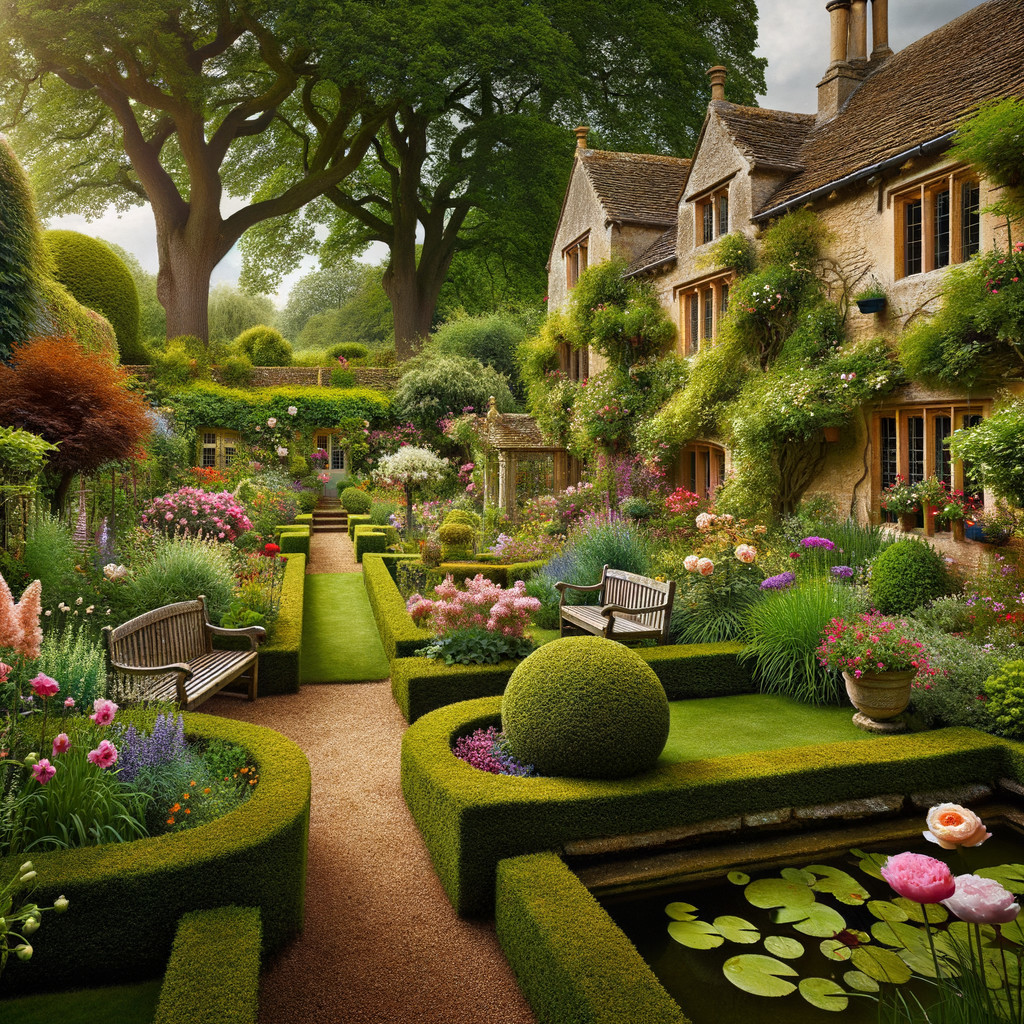 A quaint brick house with a lush garden featuring manicured hedges, vibrant flowers, and a neatly kept lawn, under a blue, partly cloudy sky.