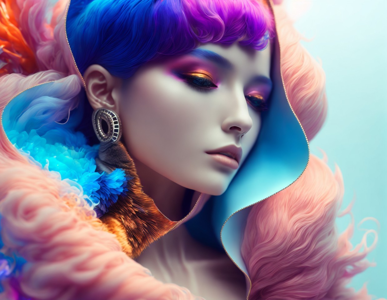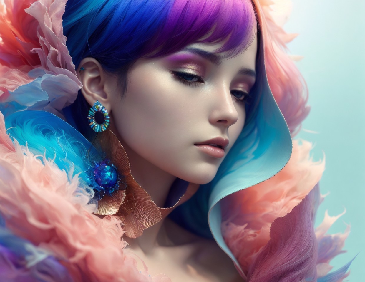 A digital artwork of a girl with violet hair and an earring, surrounded by soft, ethereal colors and feather-like textures.