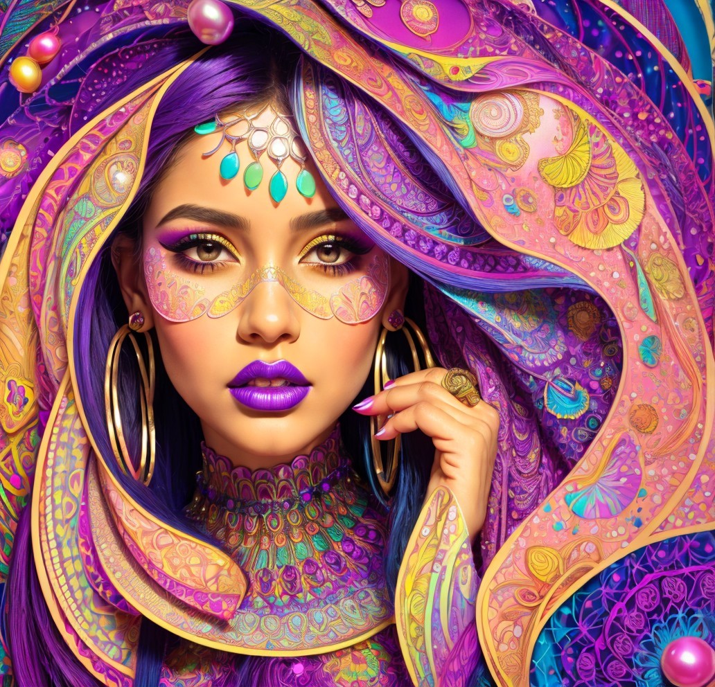 Beautiful colorful portrait, pop art papercut illustration ,intricate details, realistic mouth, big eyes, organic candyfloss, contrasting colors, acid spill, purple pearl earrings ,golden ratio, watery lithography portrait, zentangle line graphics work of woman's face, lightning burst organic burning, exotic, intricate candyfloss, colorful paper cuts, tints of pointillism , hyperdetailed folded paper style, colorful iridescence, intricate colorful detail, bioluminescent glow, vector 7:4, volumetric lighting, extremely detailed, pinkish plushy psychpomp, delicate lines of symbiotic candyfloss, lines of bioluminescent candyfloss hairstyle, smoke(0.8), colorful iridescence(0.7), magical essence, creamy illustrative cuts, volumetric lighting, (extremely detailed plasticity, candyfloss flares 9:5), marshmallows in the edge, texture patchwork, youthfulness, colorful iridescence, paper cut relief, intricate ornamental beauty, gorgeous zentangle, vibrant screws, luminous pearls, glossy highlighted hair, mythical lushness, octane render, bright streaks in furry highlighted reflections on face, maximalism,biomorphic shapes