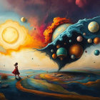 A surreal landscape features a figure walking towards a cosmic scene where celestial bodies swirl from a fiery vortex, merging day and night, symbolizing the connection between Earth and the universe.