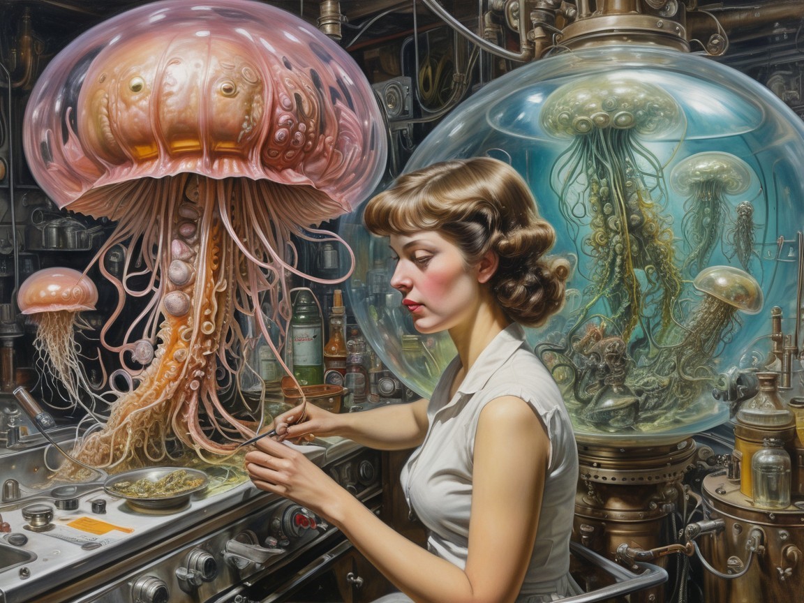 The image features a woman in a vintage-style laboratory, delicately handling a bowl of food while large, colorful jellyfish float in glass tanks behind her, blending science and surrealism.