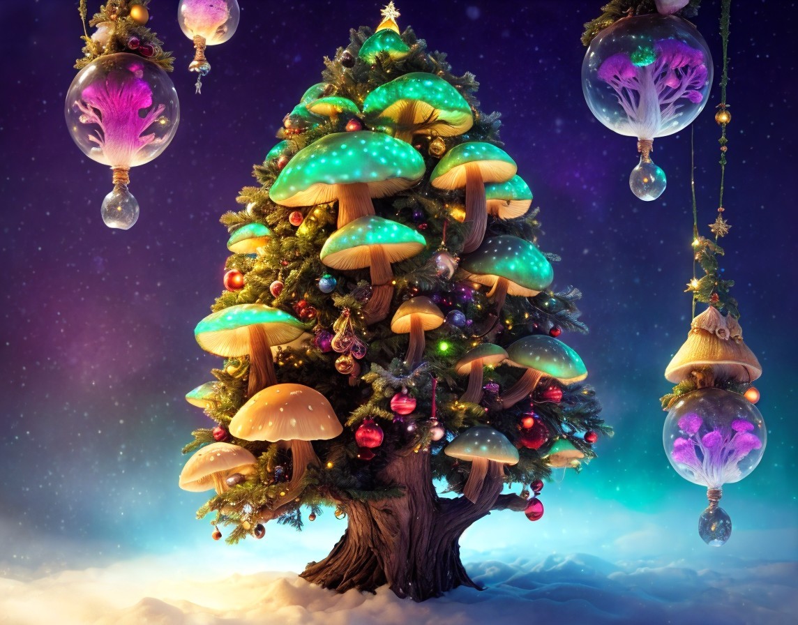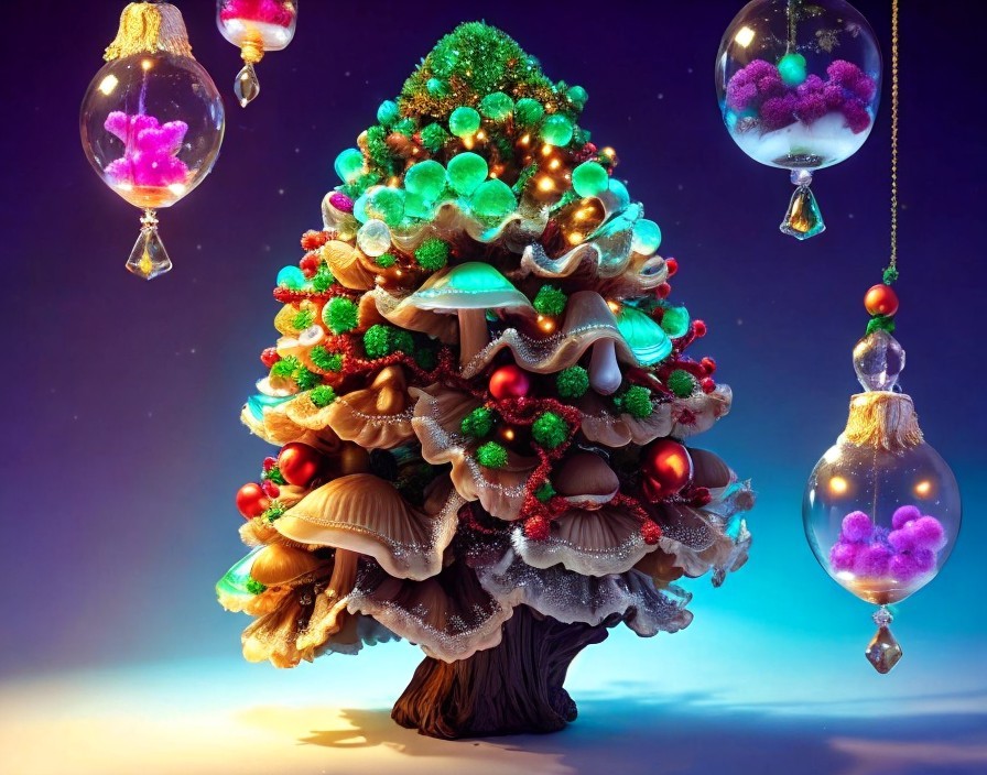 Prompt: "Christmas tree with lots of human brains hanging from its branches (transparent:1.5) glass human brains filled with (bioluminescent:2) mushrooms"