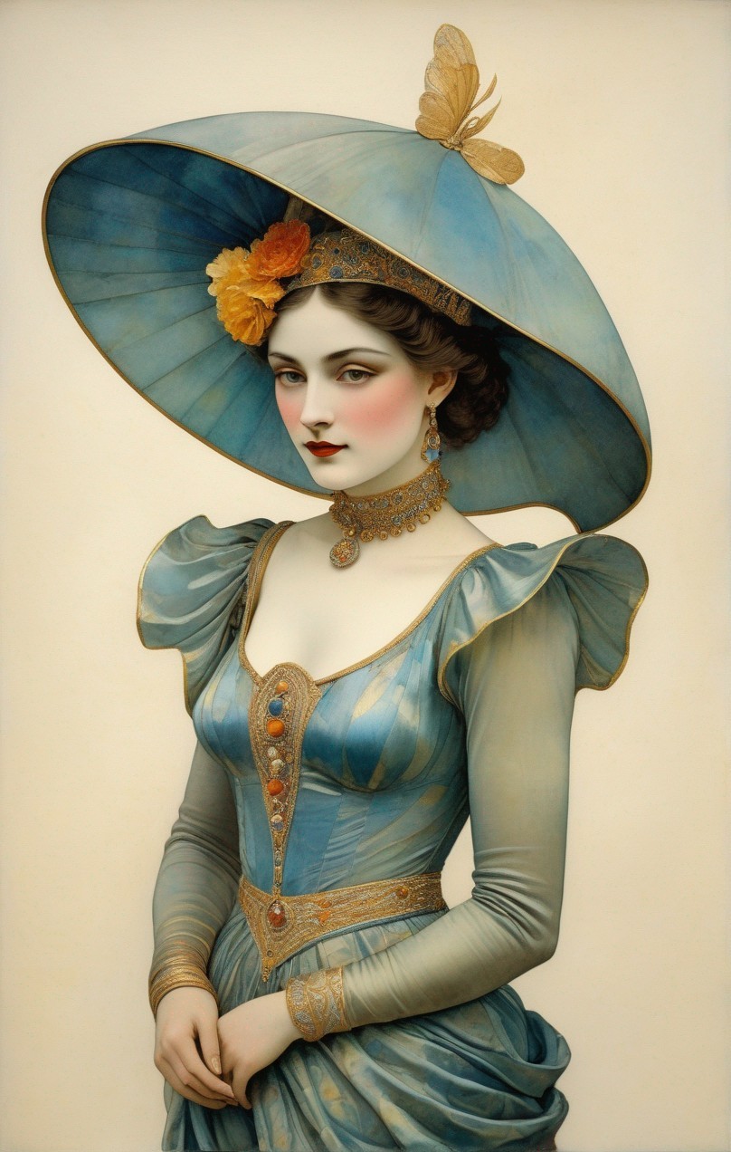 Prompt: Single image. Art nouveau. The quantum nature of things. A circus performer colors: silk iridescent texture in watercolor and ink, vibrant colors with gold foil detail metallic bronze, saffron, indigo, gold