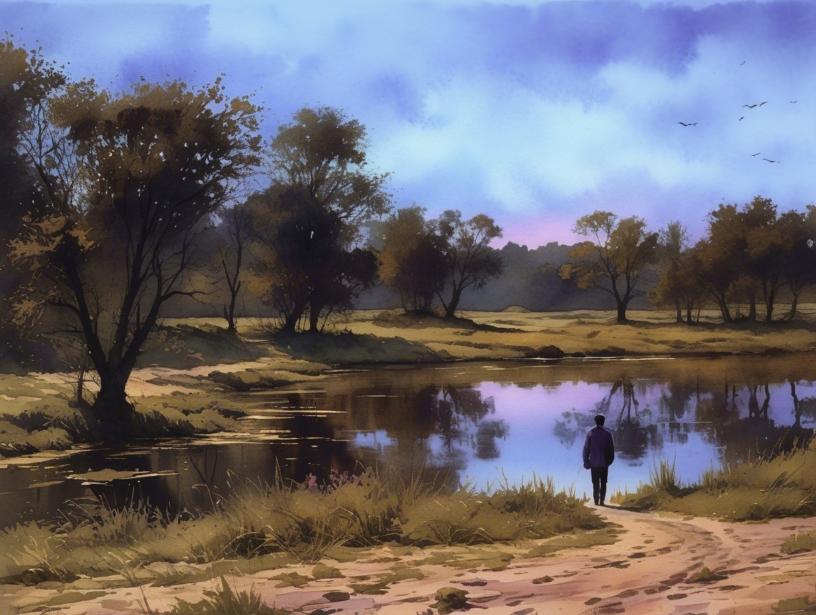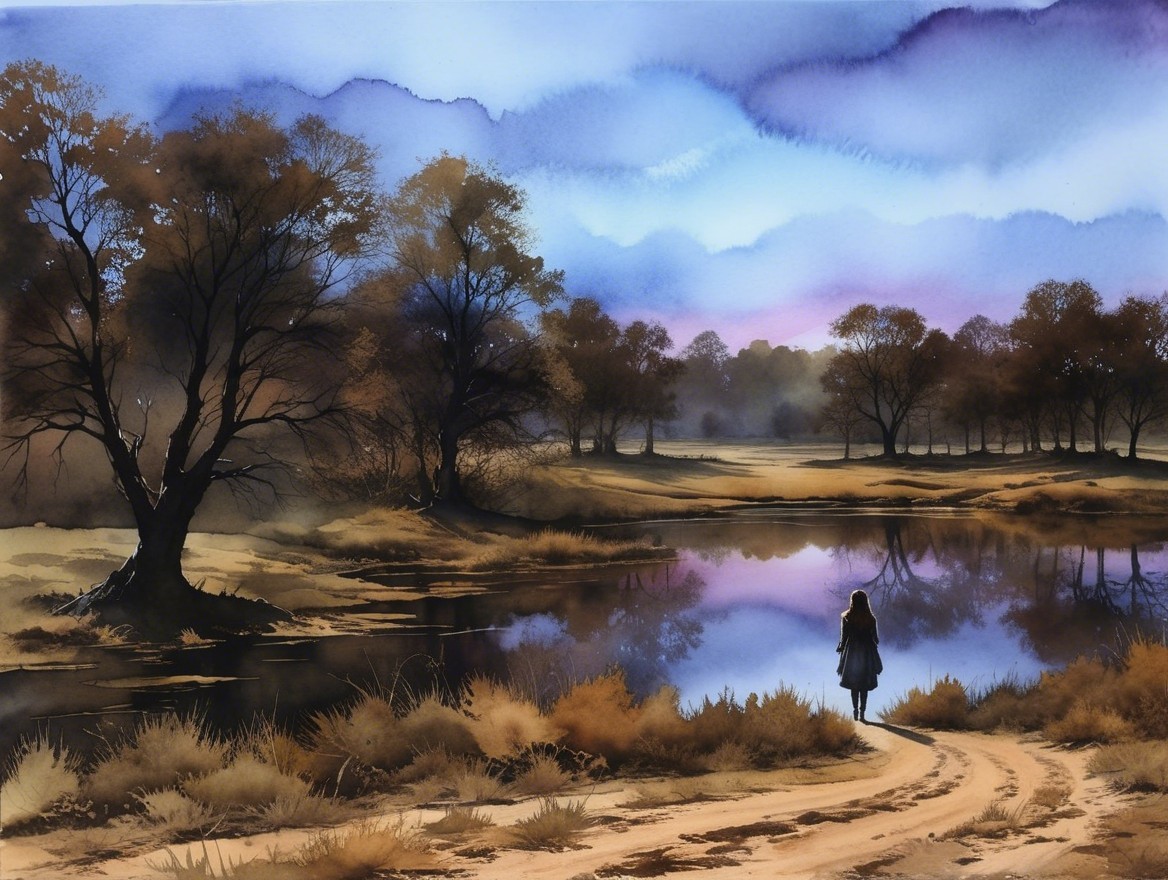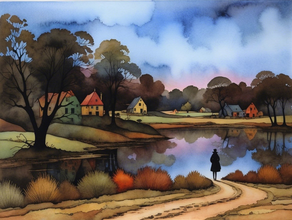 A tranquil landscape features a winding path beside a reflective lake, with scattered houses and trees. A person in a black dress walks a dog, set against a backdrop of soft clouds and hills.