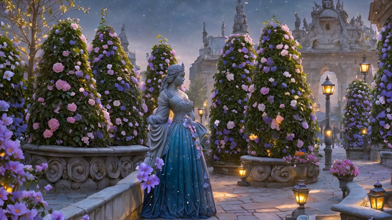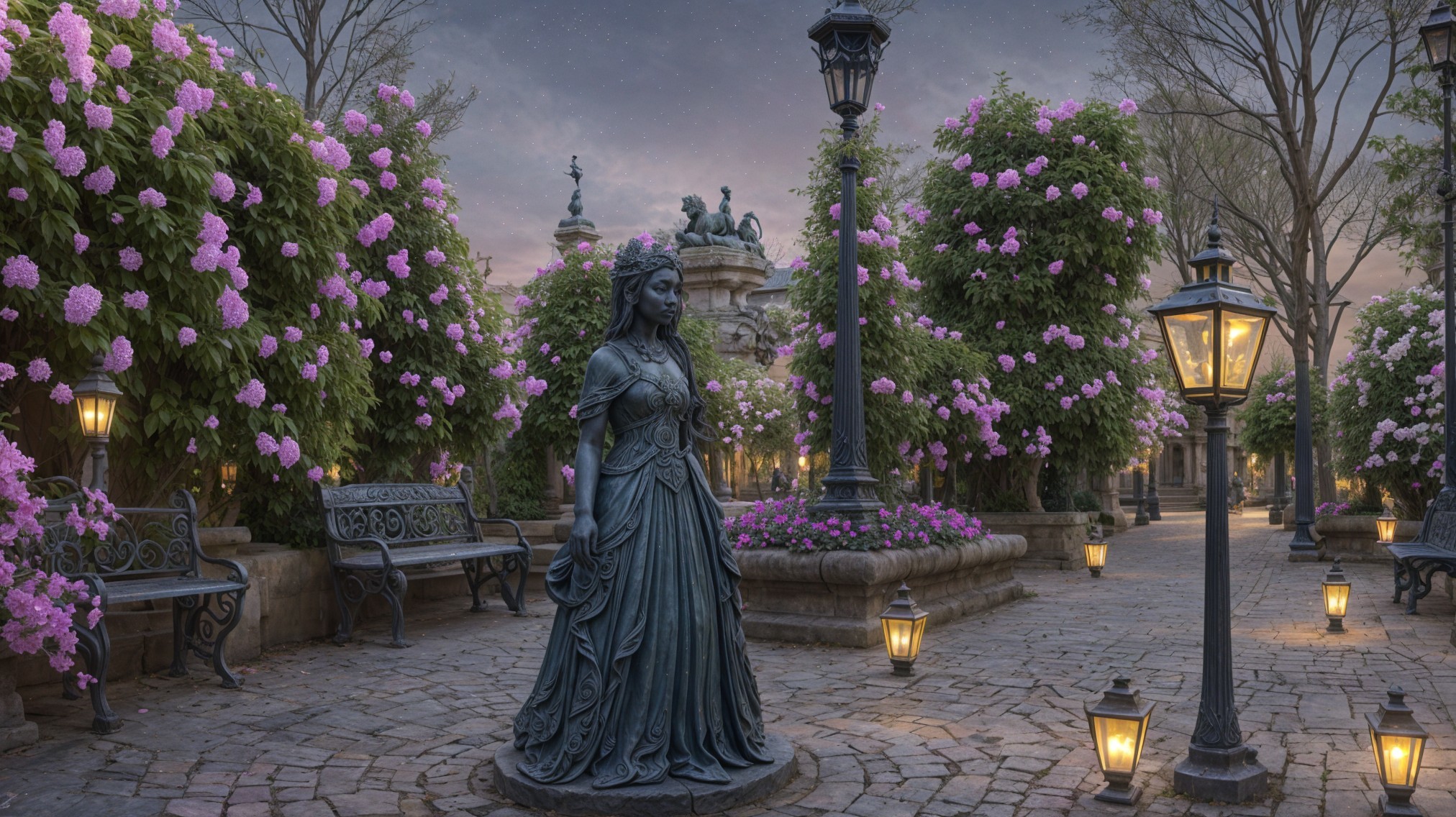 A charming garden path lined with vibrant flowers leads to a picturesque gazebo. Soft sunlight filters through the trees, illuminating the serene atmosphere, enhanced by glowing lanterns.