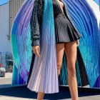 A model stands confidently in a vibrant outfit featuring a colorful jacket and a structured skirt. She wears a unique bird-themed hat, with a striking blue and yellow background behind her.