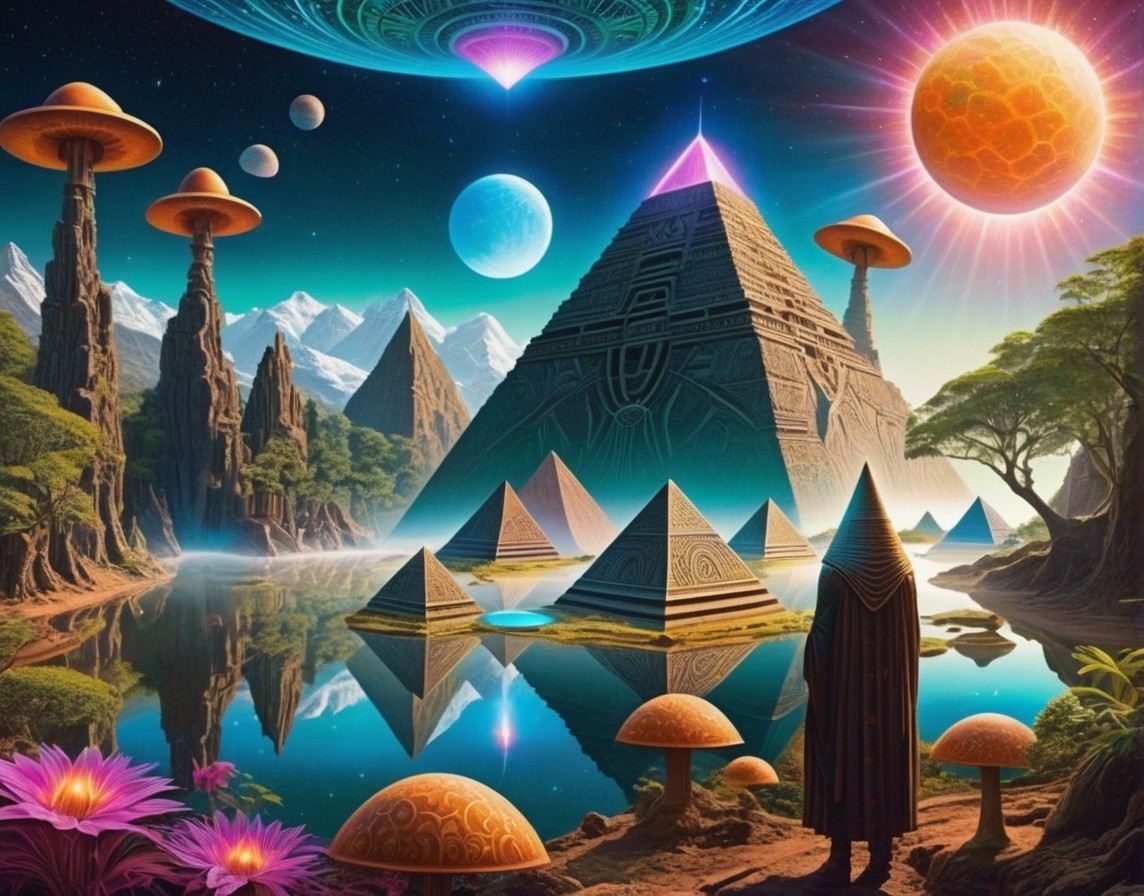A vivid sci-fi landscape with pyramids, an alien figure, colossal mushroom structures, celestial bodies, and a vibrant color palette.
