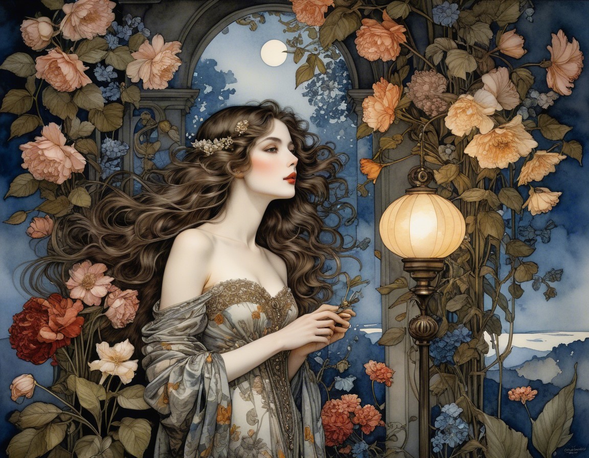A serene woman with flowing hair stands amidst blooming flowers under a twilight sky. She radiates elegance, adorned in a beautifully detailed gown, surrounded by soft moonlight and vibrant petals.