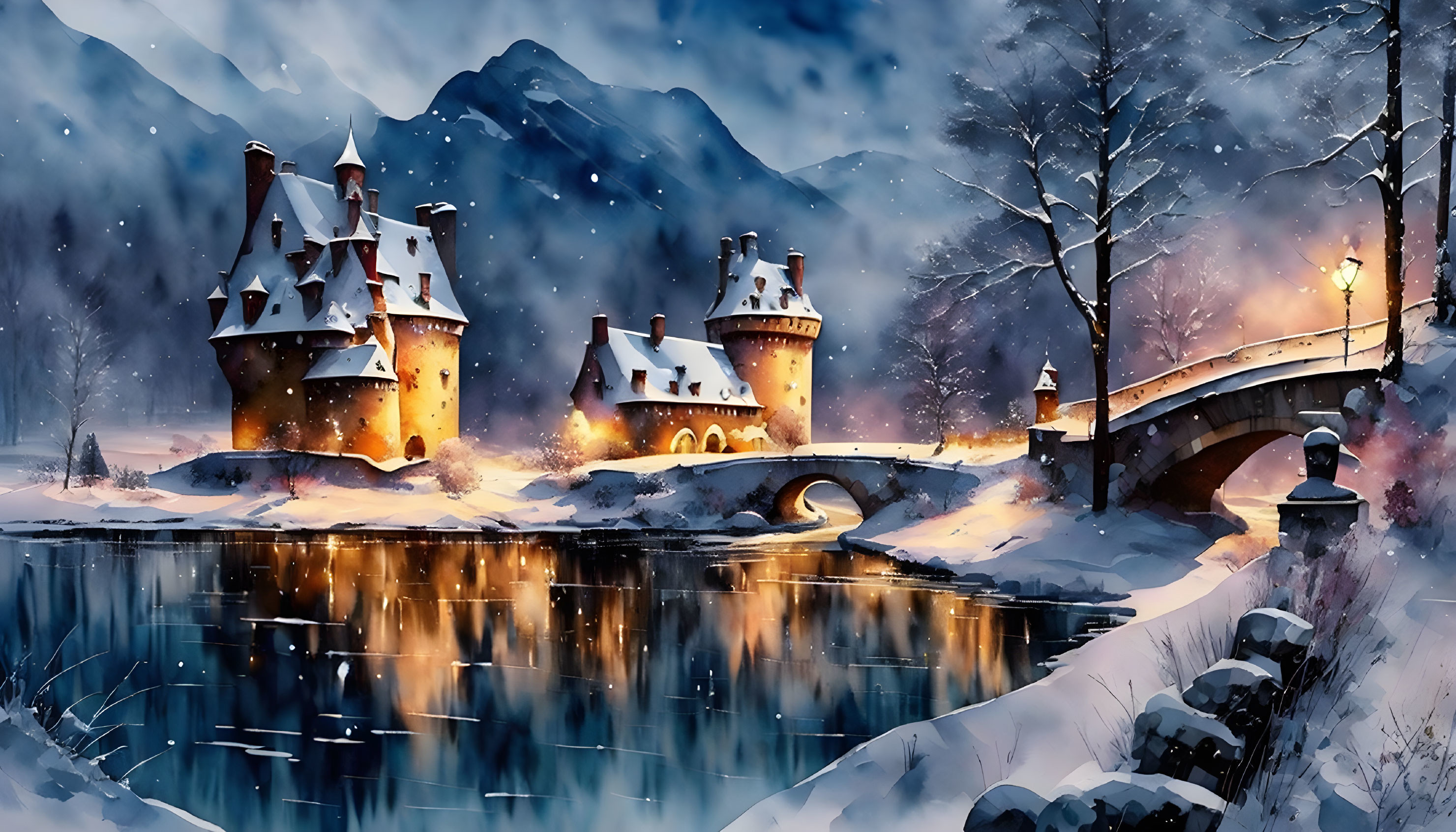 Majestic castle in serene snowy landscape with icy lake