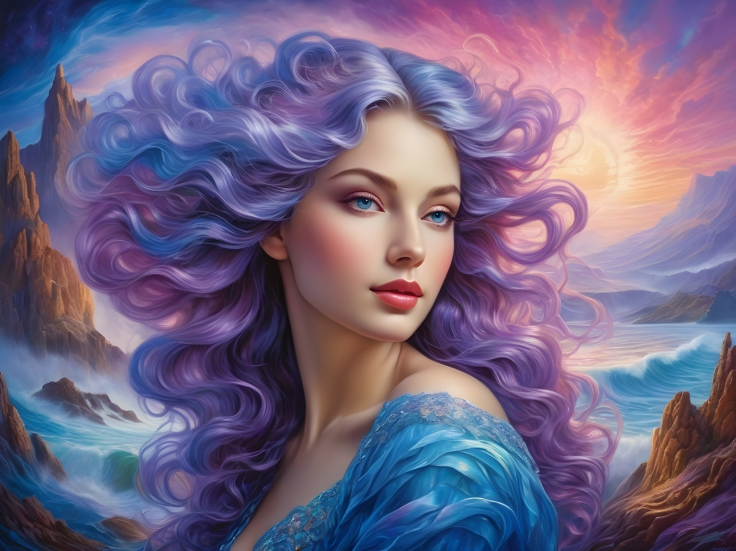 A beautiful woman with flowing purple hair gazes thoughtfully into the distance. She wears a soft blue dress, surrounded by a vibrant, dreamlike landscape of mountains and ocean.