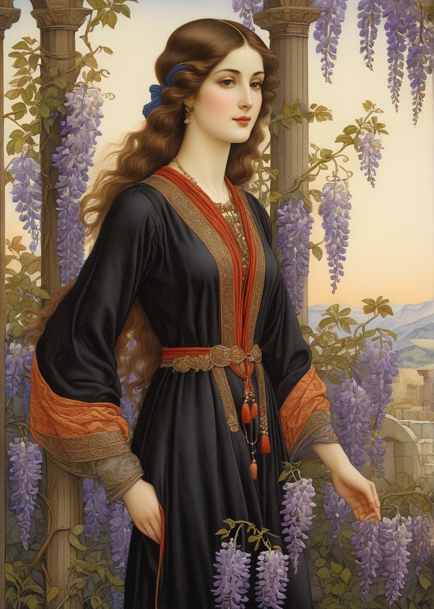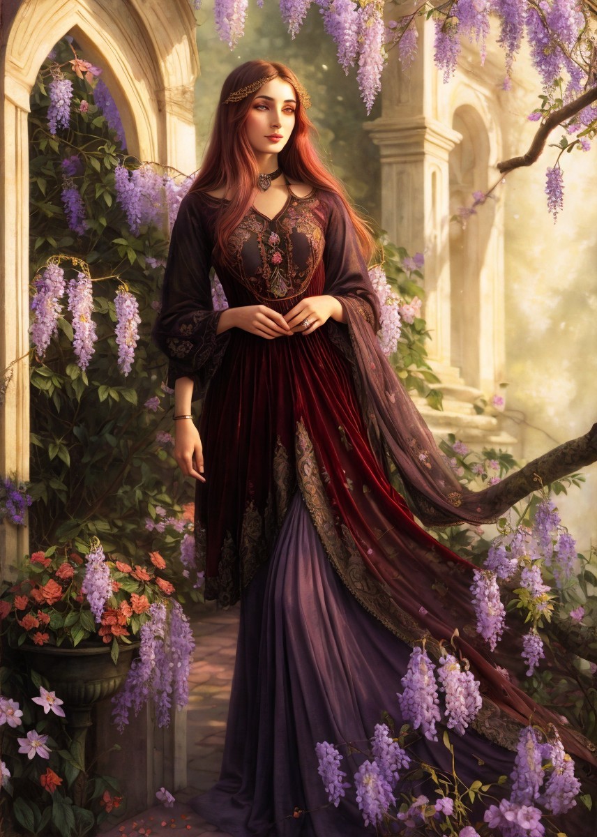 Beautiful woman admiring the spring wisteria. 3rd century Persian miniature art, warm peach, paprika, Ruby red, Velvet Black, Shabby, Dull Gold, Amber Gray, Golden Ratio, Surreal Fantasy, Elegant, High Definition Ultra Fine 3D Line, Zenangle Style, Watercolor Patchwork , Arthur Rackham Style, Paul Kidby, , Jacek yerka, Extremely Detailed, Intricate, Thoughtful, HDR, Fractal, Beautiful, Award Winning, Fantasy Look, Fantasy, Crisp Quality