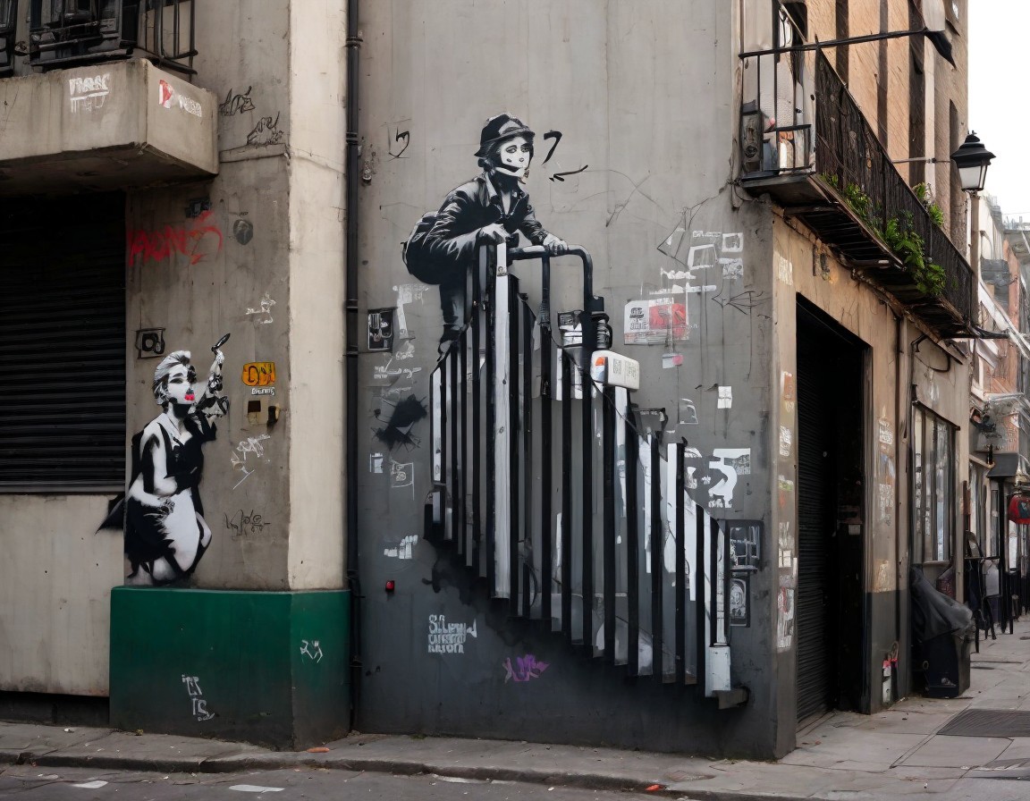 Urban street corner mural of man with camera amidst graffiti tags