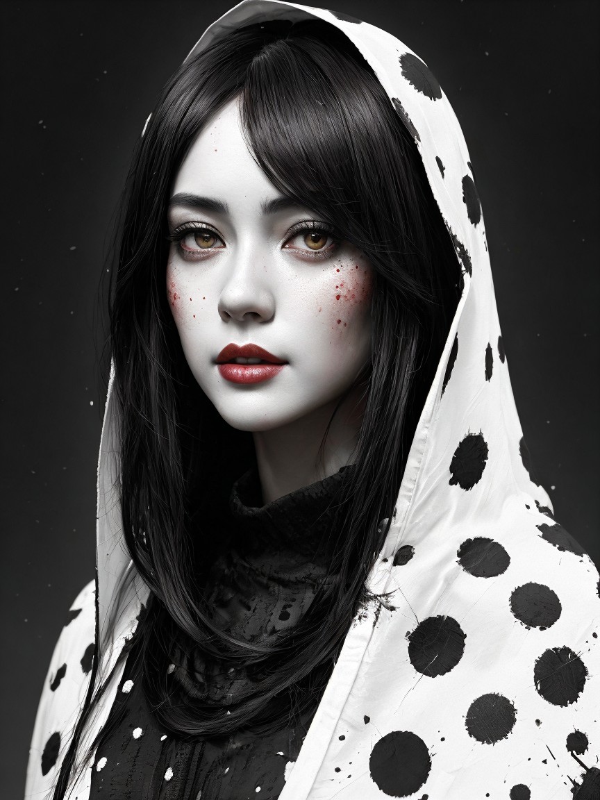 A portrait of a young woman with dark hair and striking freckles, draped in a white hooded cloak adorned with black polka dots, exuding a mysterious and captivating aura.