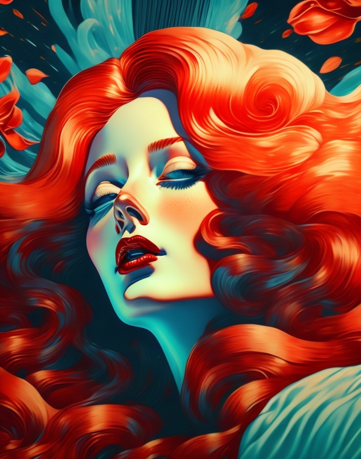 A digital artwork of a woman with flowing red hair, vivid makeup, and leaves suggesting an autumnal theme.
