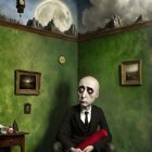 A surreal artwork features two figures; one with horns and the other balancing a clock on their head. Dark, whimsical elements like a rose and birds enhance the eerie, dreamlike atmosphere.