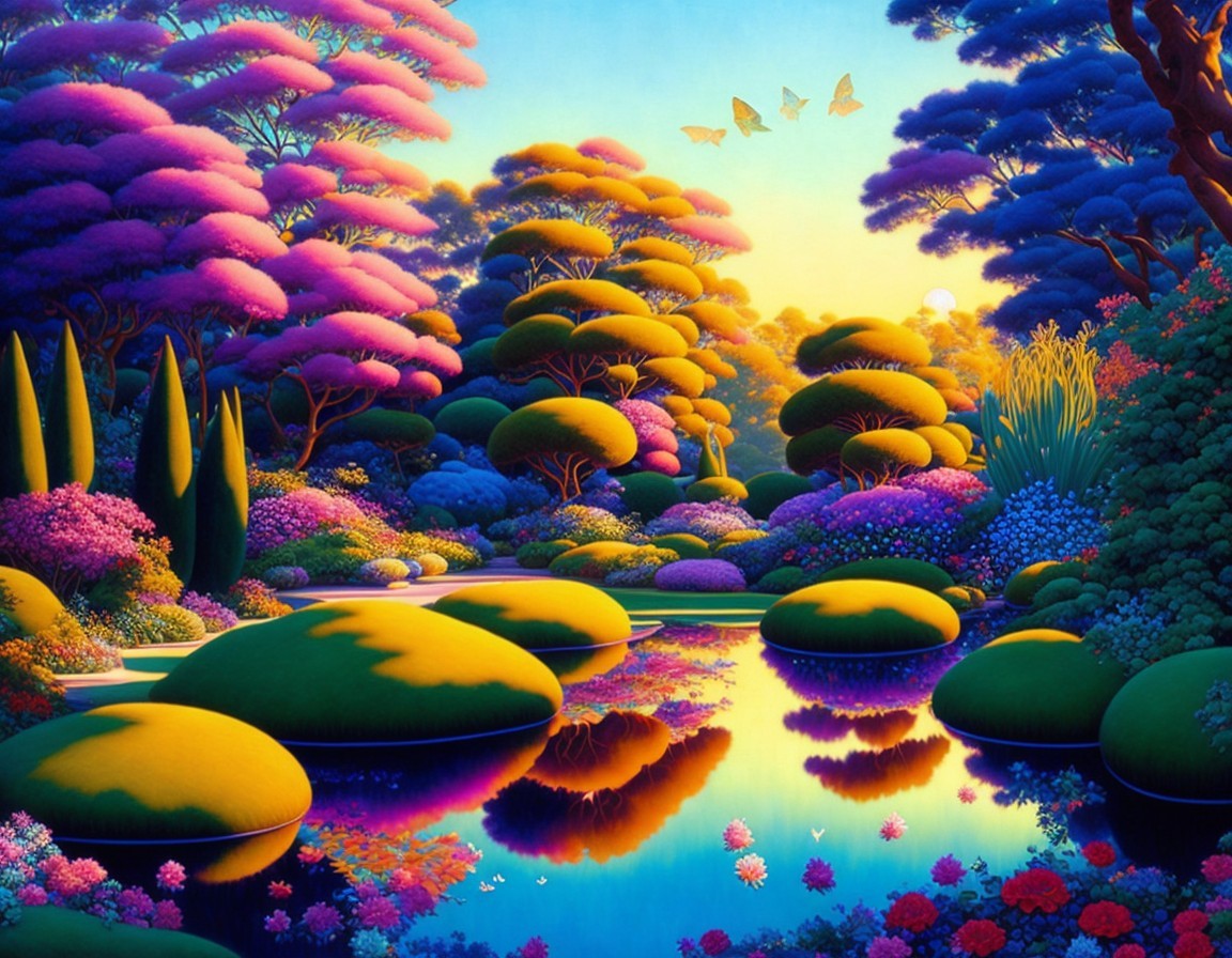 A vibrant, fantastical landscape with purple trees, a reflective pond, green hills, colorful flowers, and flying birds at dusk.