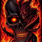 A fiery, skeletal figure adorned with dark armor and glowing red eyes, sitting amidst a landscape of flames and shadows, radiating a menacing aura of power and danger.