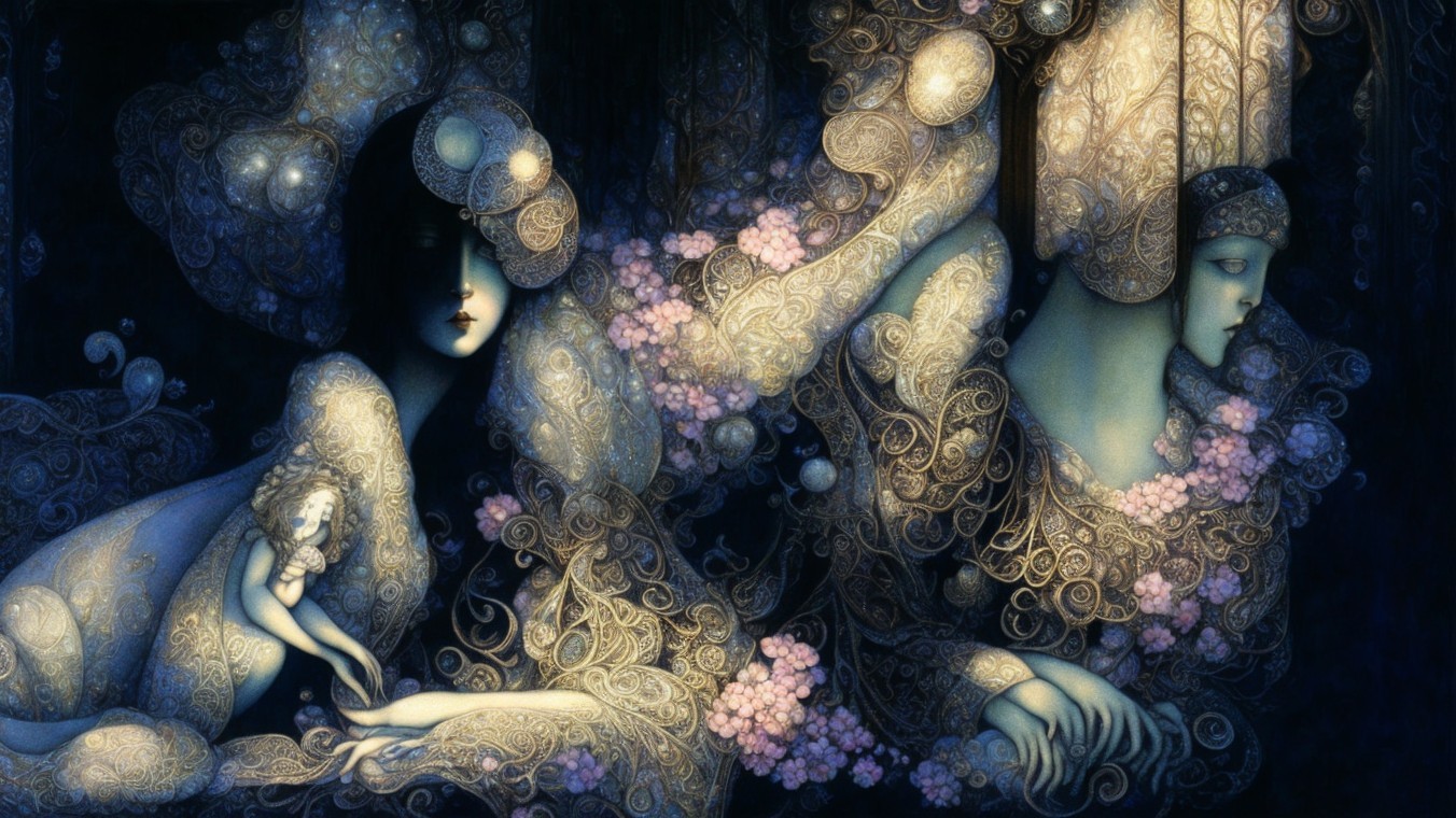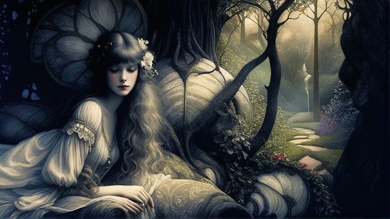 A serene fairy is depicted in a lush, enchanted garden, surrounded by intricate, swirling vines. She wears a delicate gown and a floral accessory, gazing thoughtfully toward a glowing path.
