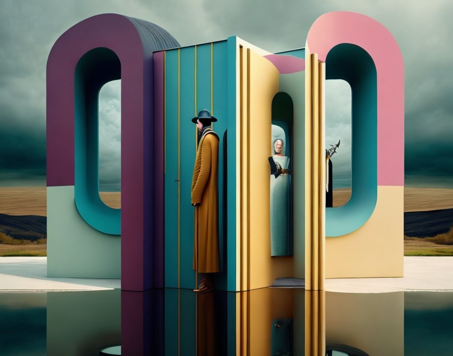 A surreal image featuring a person in a trench coat within a set of colorful, curved, and striped structures reflecting on water.