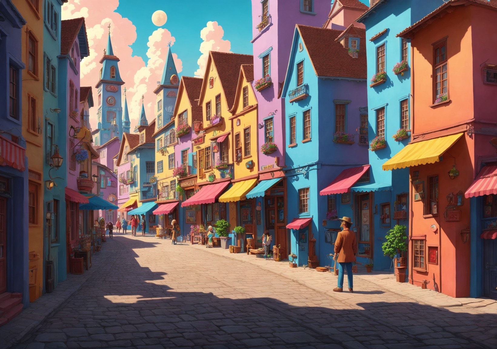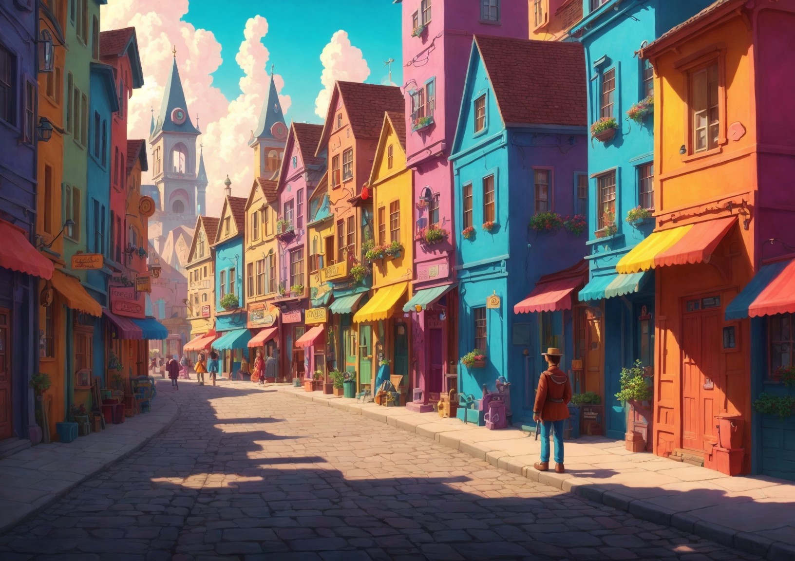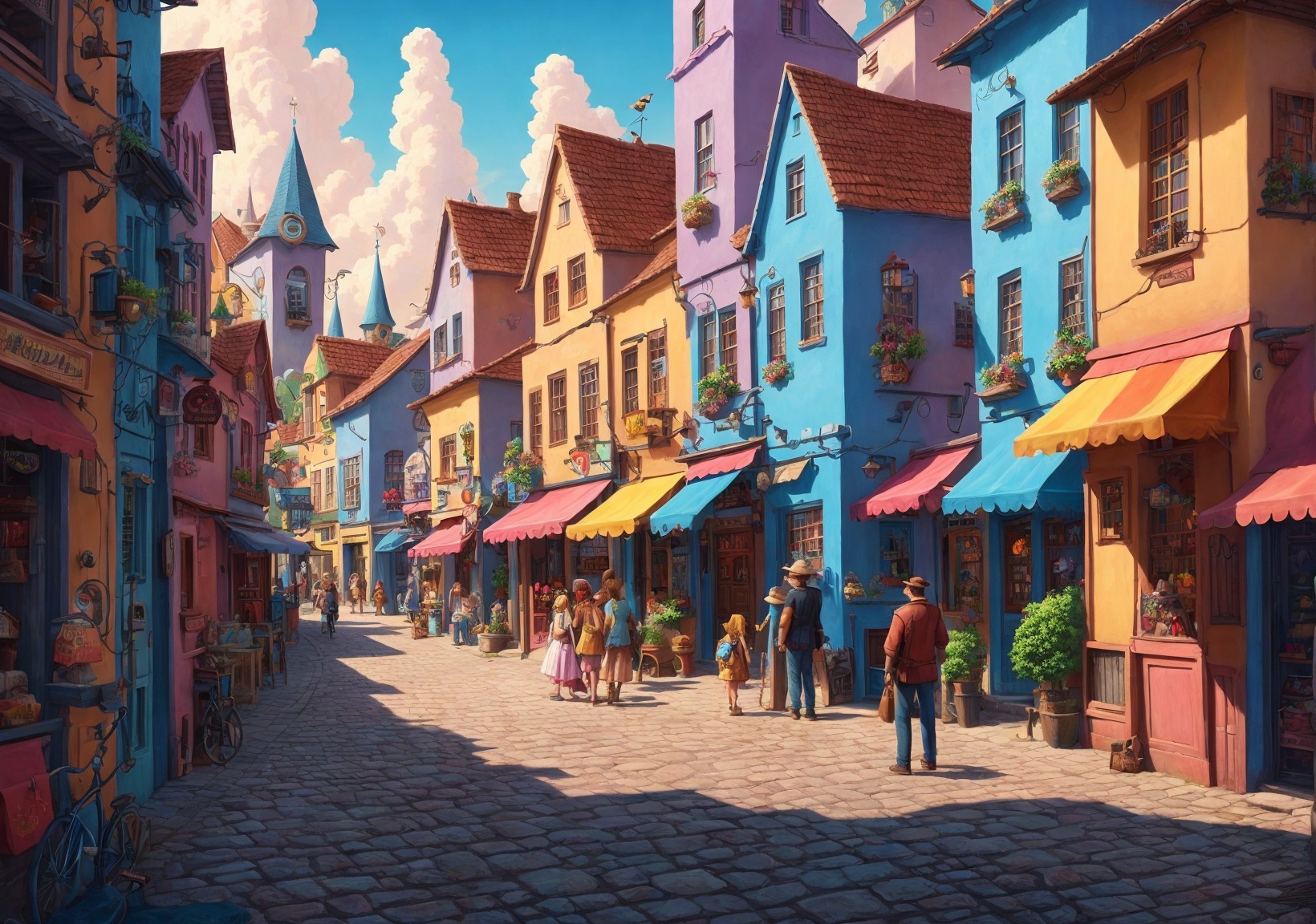 Colorful Vintage Town Cobblestone Street with Market Stalls
