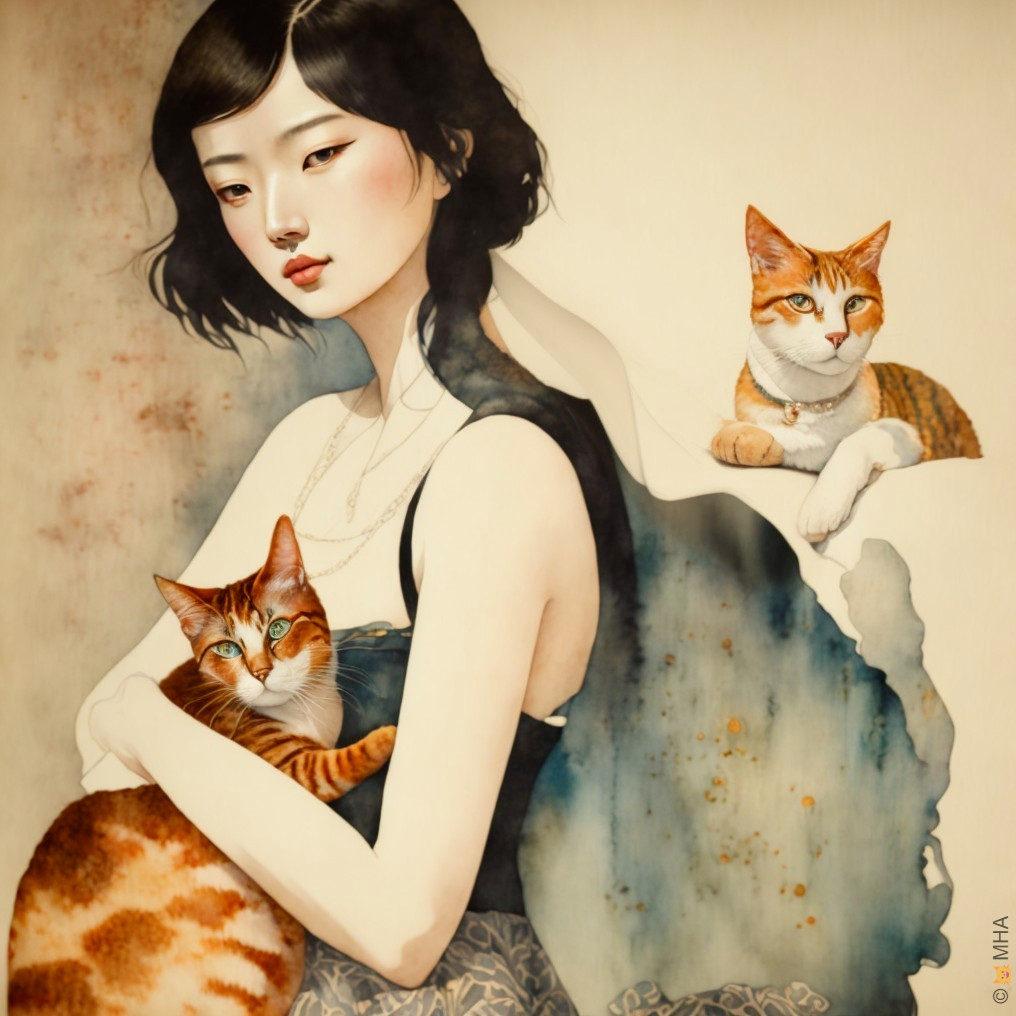 A serene portrait of a young woman with delicate features, holding a vivid ginger cat in her arms, while another cat lounges nearby. The soft watercolor background merges with the subject, symbolizing a seamless connection between human emotion and feline companionship.