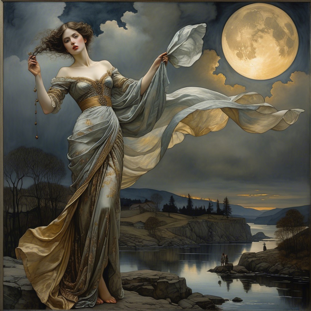 A serene woman with long, wavy hair sits elegantly on a dock, wearing an ornate gown. The moon shines brightly overhead, illuminating a distant castle and a dramatic, cloudy sky.