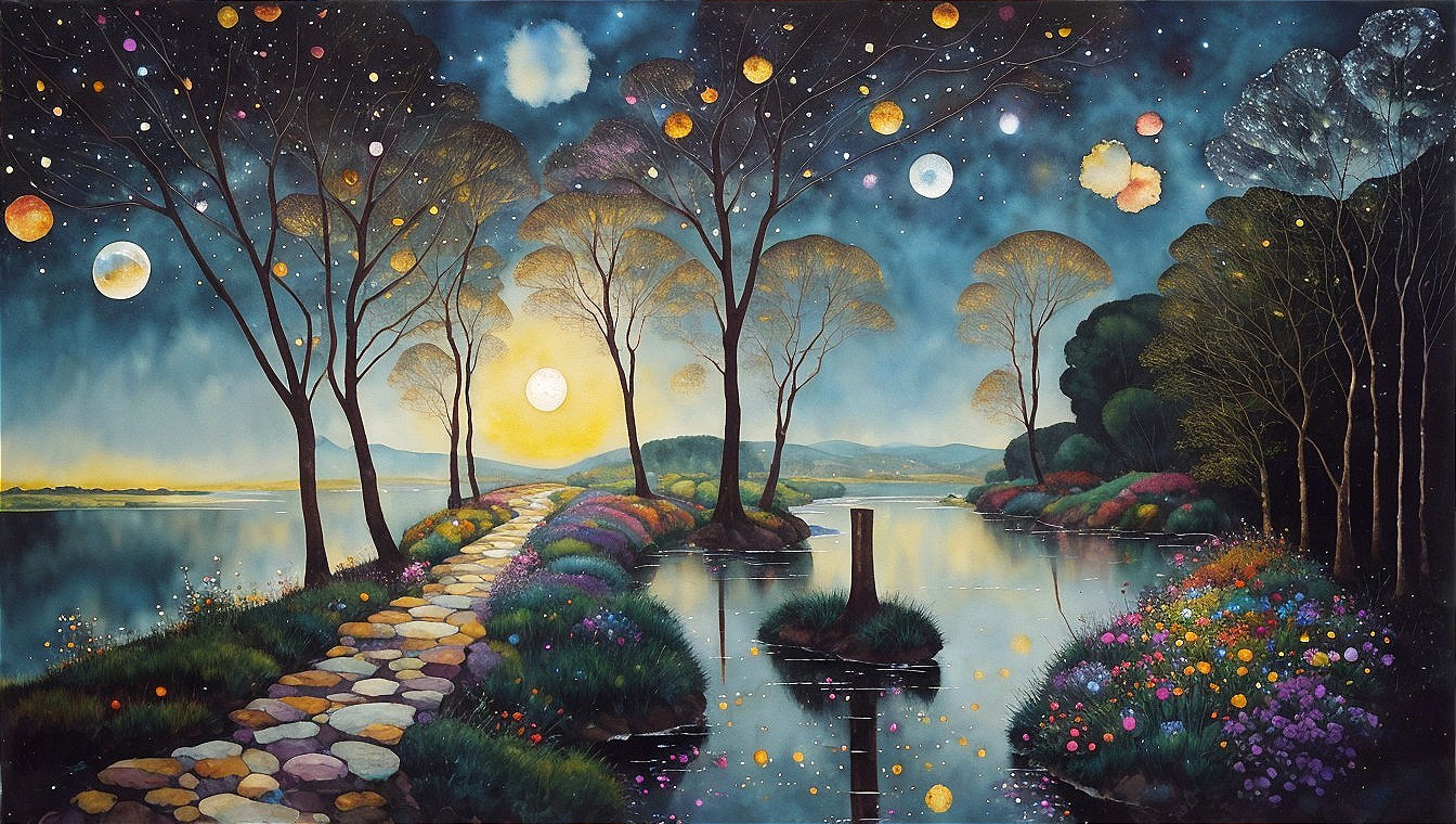A whimsical painting featuring a serene landscape with trees, a stone path, vibrant flora, and multiple moons and stars in a night sky.