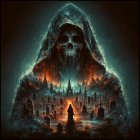 A cloaked figure stands before a towering, skeletal entity amid a ruined landscape. Dark, eerie ruins loom in the background under a glowing moon, creating a haunting, mystical atmosphere.
