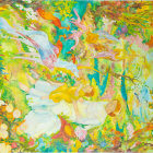 An enchanting illustration featuring whimsical, ethereal faces intertwined with vibrant, colorful village scenes, showcasing a blend of nature and fantasy in harmonious colors.