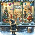 A cheerful winter scene shows children admiring a festive shop window, adorned with Christmas decorations and a tree, as snow gently falls around them, creating a magical holiday atmosphere.
