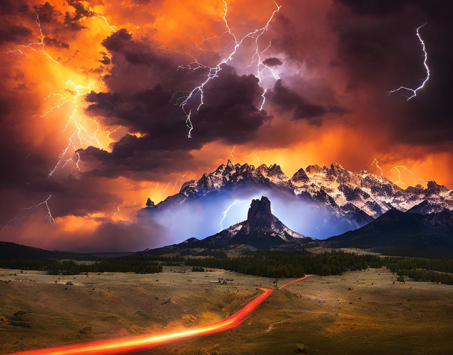 Scenic sunset over mountain range with fiery clouds and snow-capped peaks