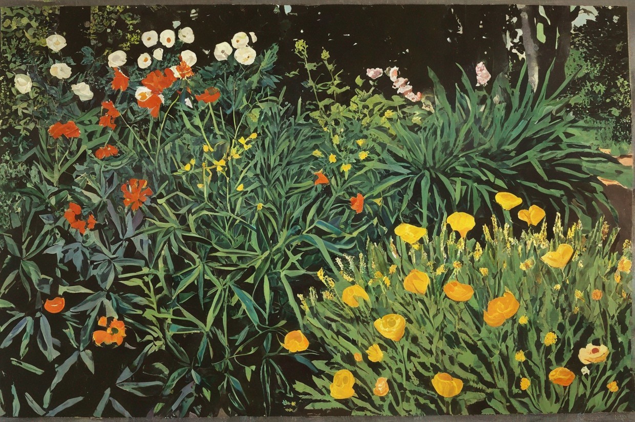 Colorful Abstract Painting with Interlocking Shapes and Circular Patterns