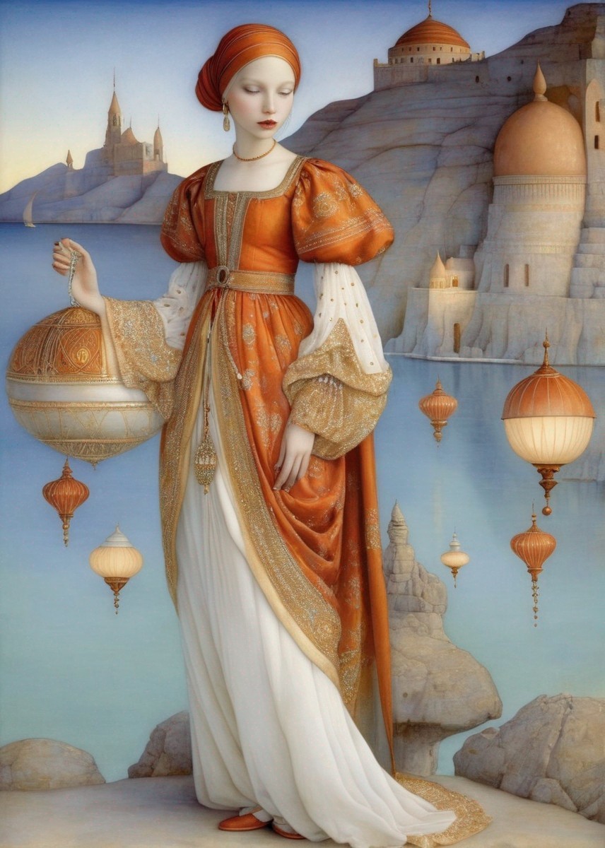 Traditional Outfit Woman with Turban in Fantastical Cityscape at Night