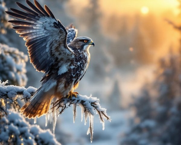 A serene scene features a bird soaring over vibrant lavender fields, bathed in warm sunset hues, creating a picturesque moment of nature's beauty.